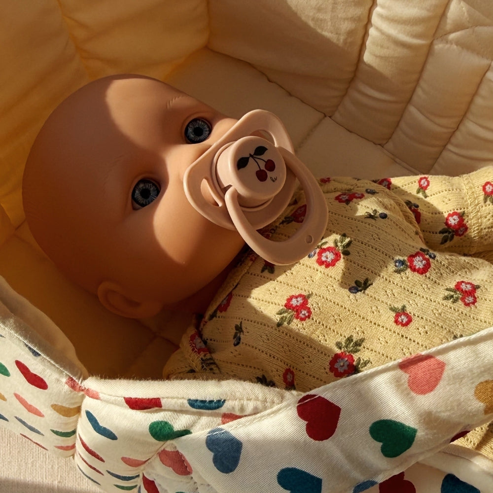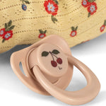 Sada obsahuje měkkou dvoudílnou bavlněnou soupravu a uklidňujícího dudlíka.