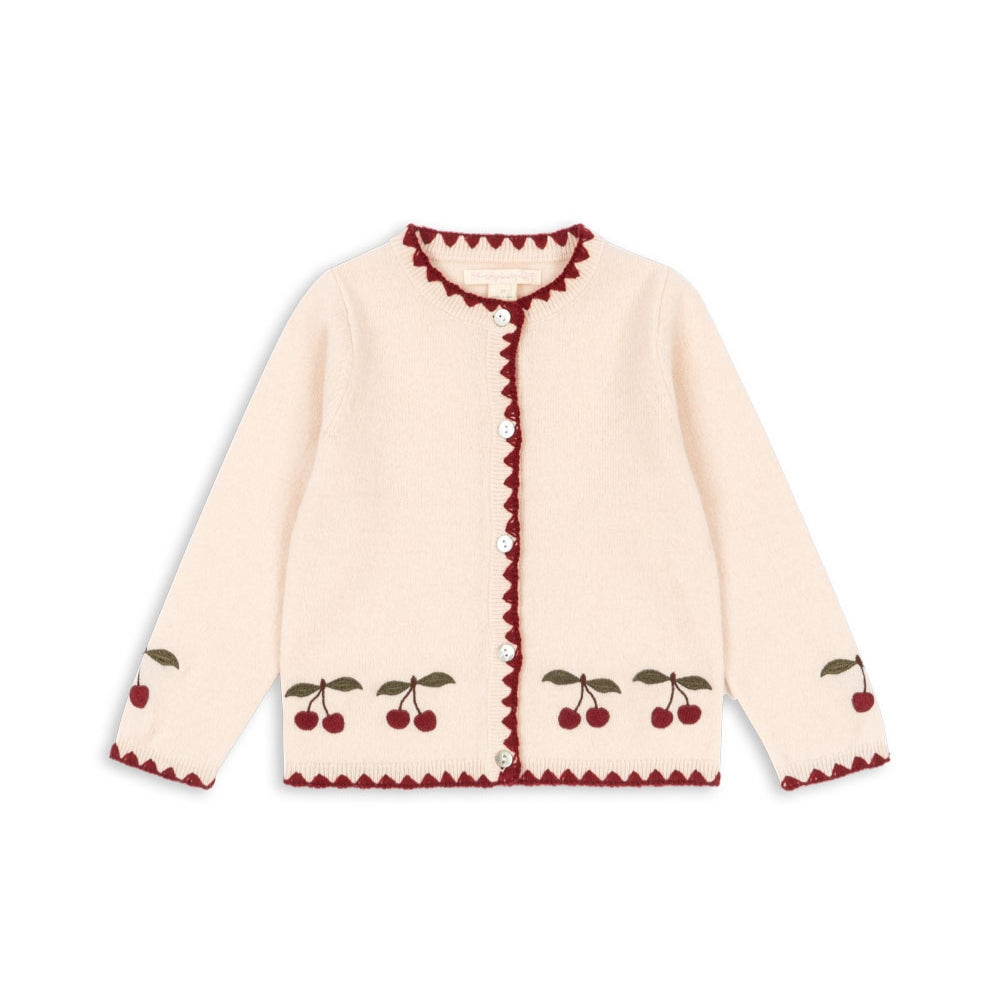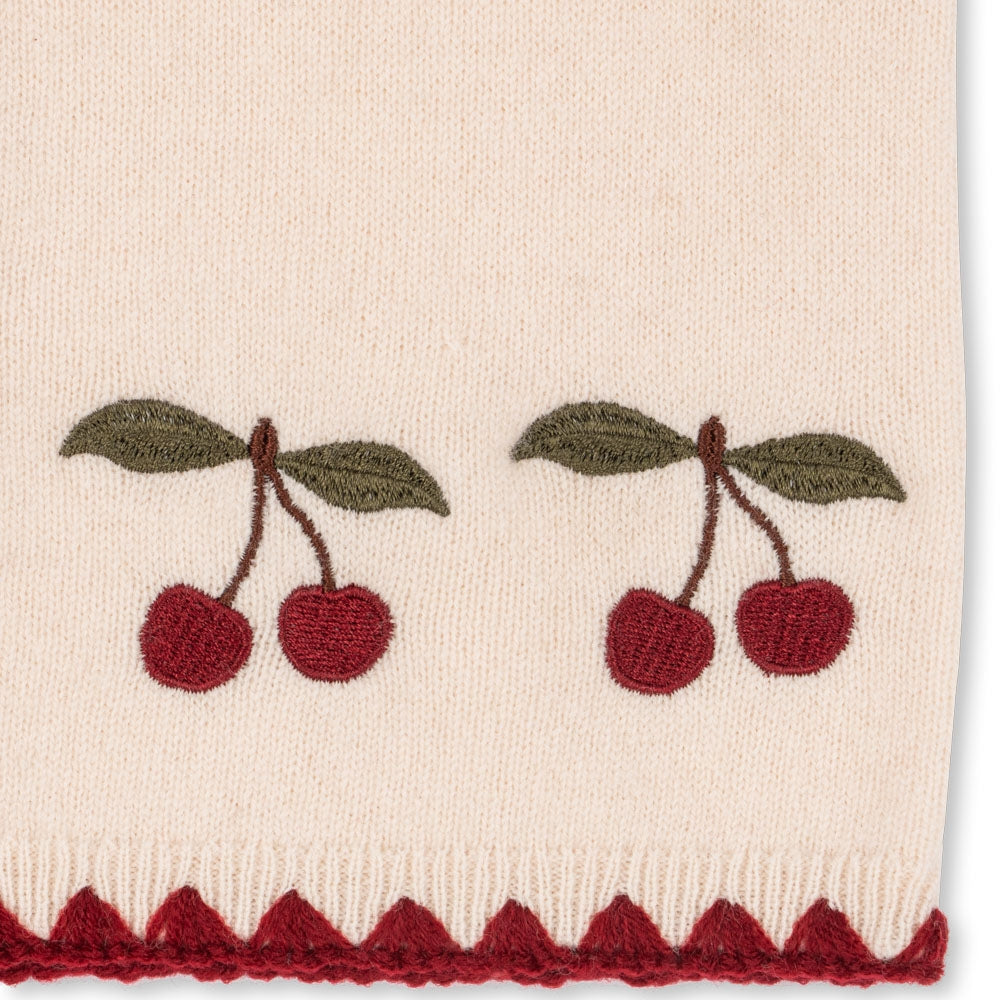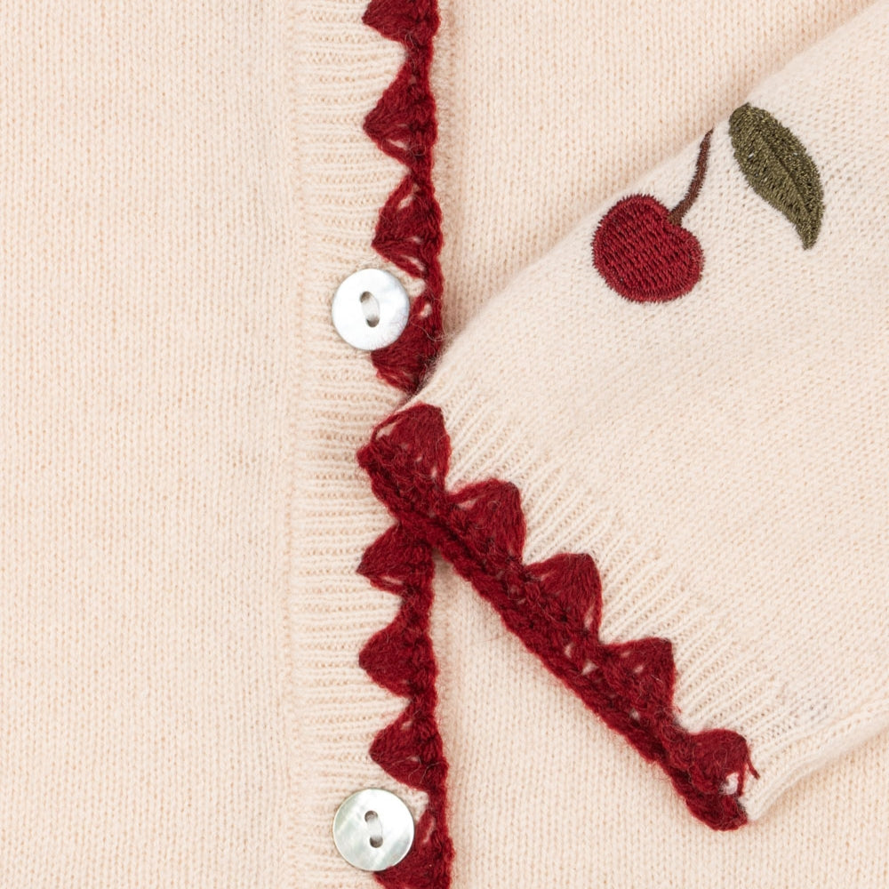 Jemné výšivky ve tvaru třešní a kontrastní lemy mu dodávají zvláštní kouzlo, zatímco zapínání na perleťové knoflíky mu dodává elegantní nádech.