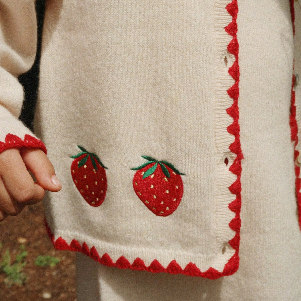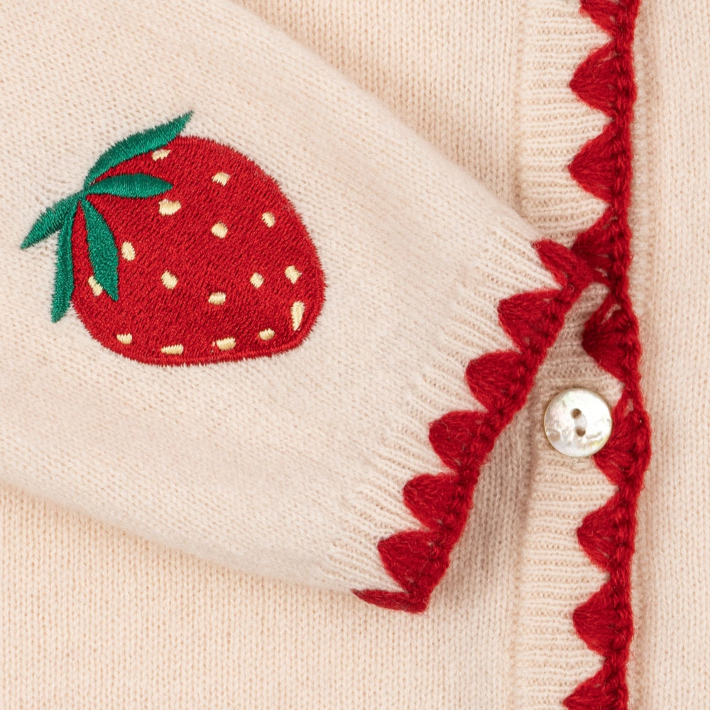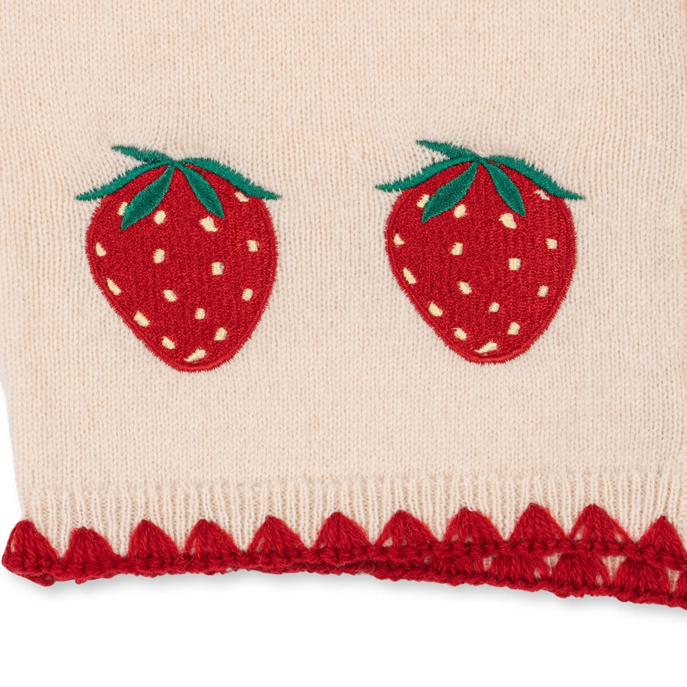 Model Collette potěší jemnou výšivkou ve tvaru jahod a kontrastním lemováním okrajů, které mu dodává zvláštní nádech.