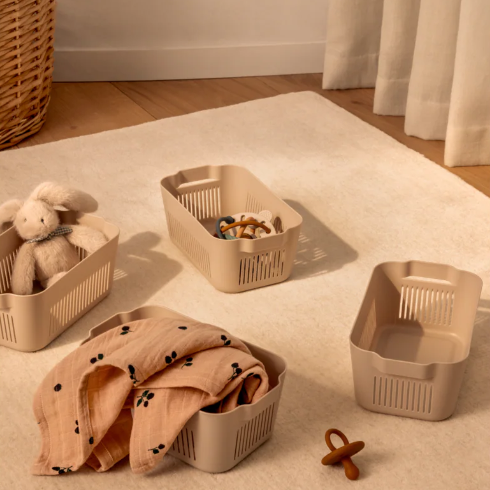 Sada košíků pomáhá pojmout drobnosti: malé hračky, ponožky, výtvarné potřeby a všechny poklady batolete.
