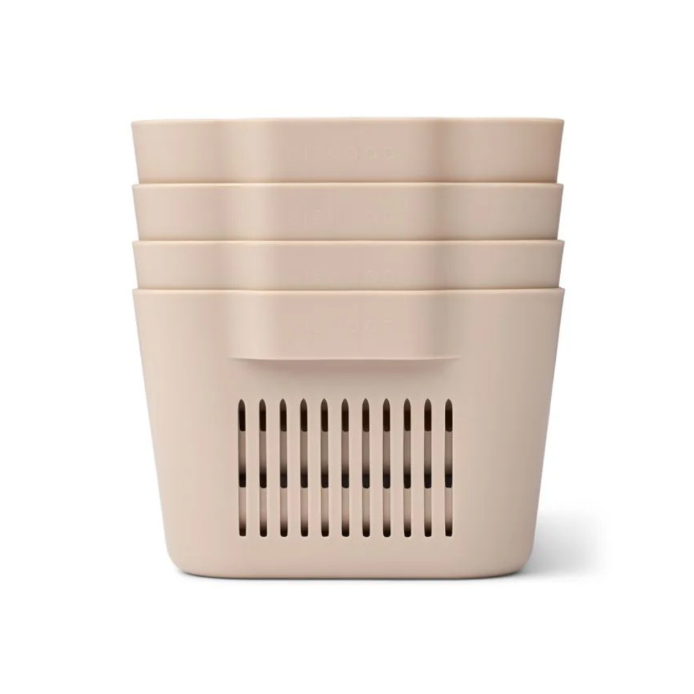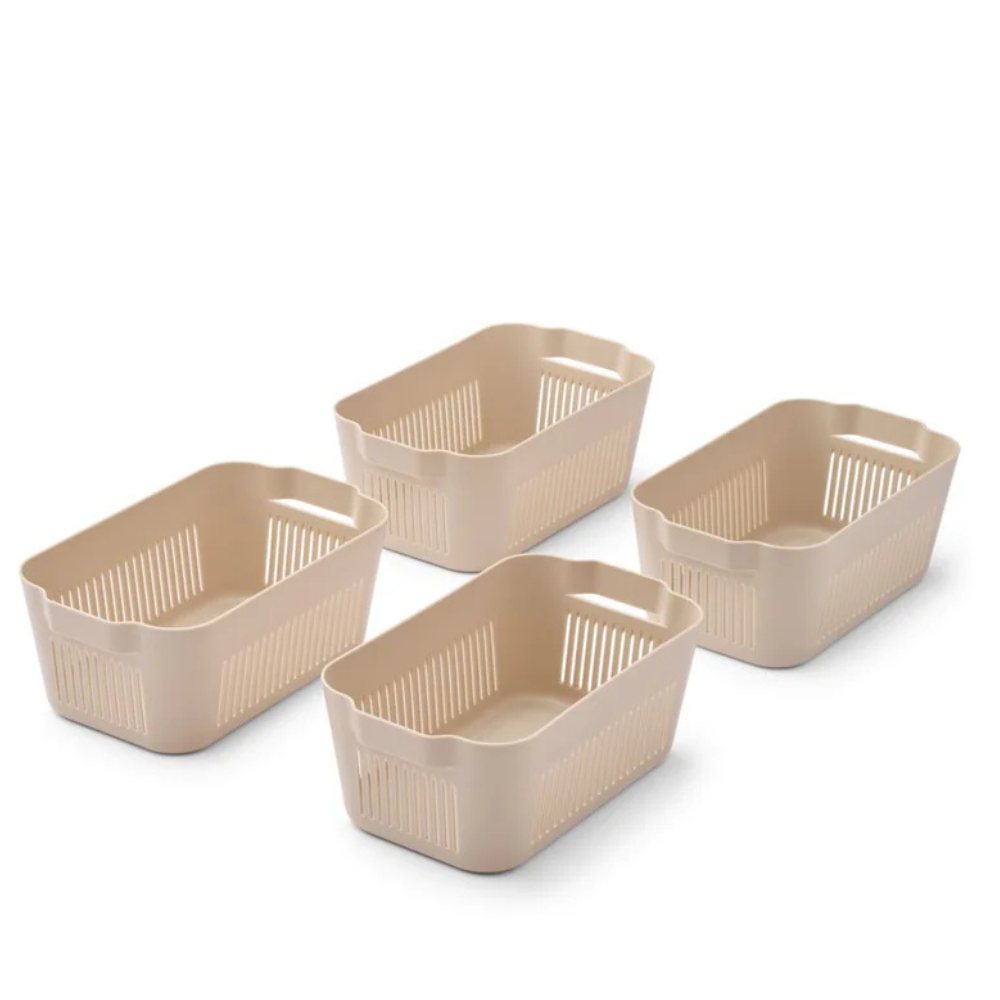 Čtyři mini košíky mají praktické úchyty, jsou lehké a prázdné se dají stohovat.