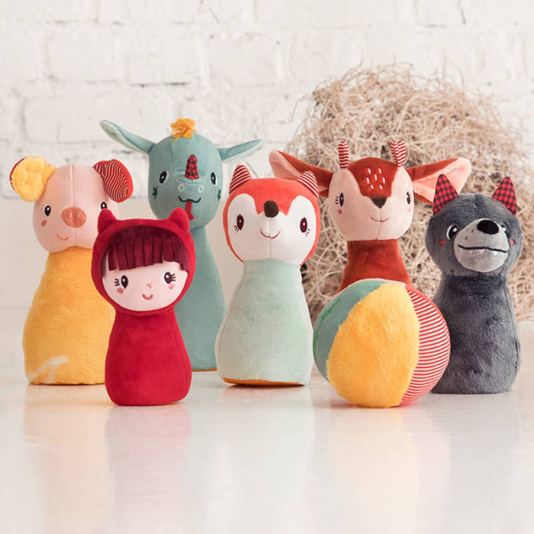 Postavičky - liška Alice, jelen Stella, prase Simon, drak Joe, vlk Louis a Červená Karkulka - mají podobu klasických kuželek, ale jsou měkké, lehké a barevné.