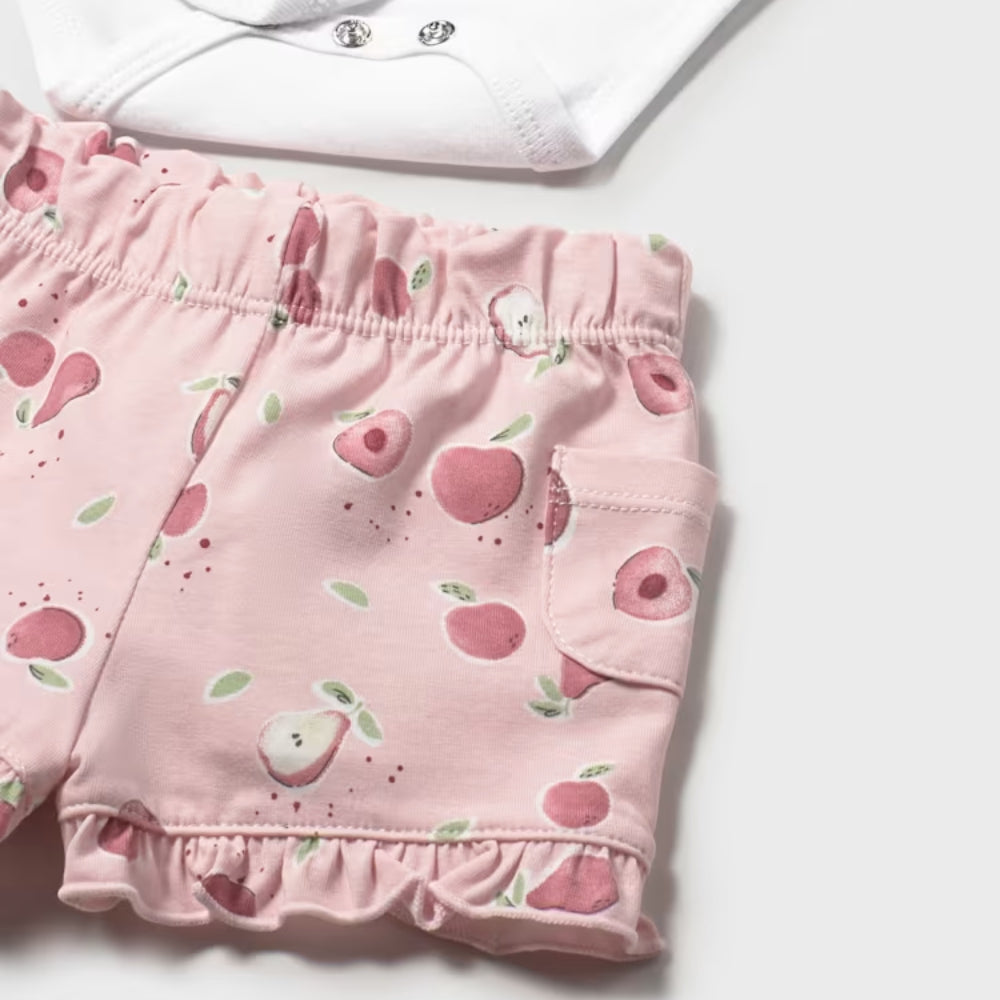 Sada obsahuje dvě body v bílé a růžové barvě a dva páry růžových šortek, které lze snadno kombinovat.