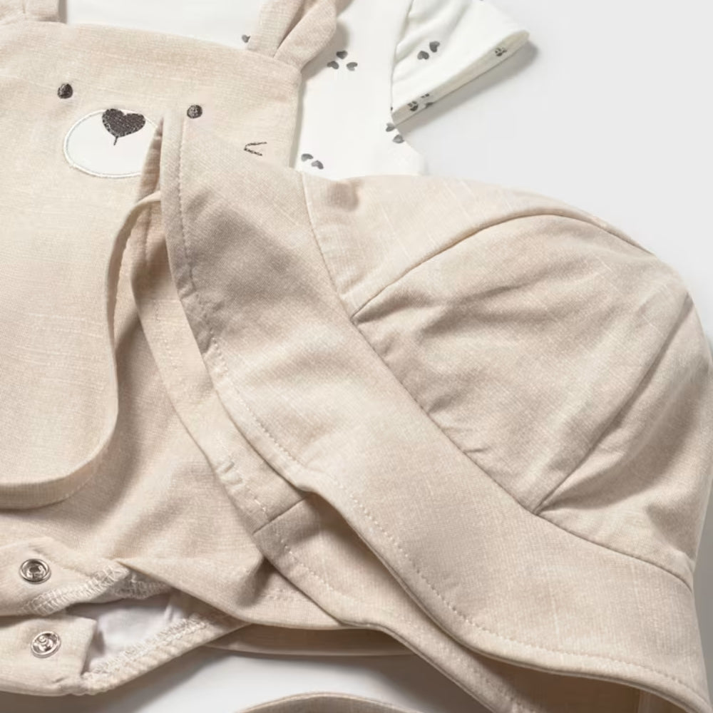 Souprava se skládá z béžového pyžama s imitací dupaček a odpovídající čepičky, které tvoří ucelený a estetický celek.