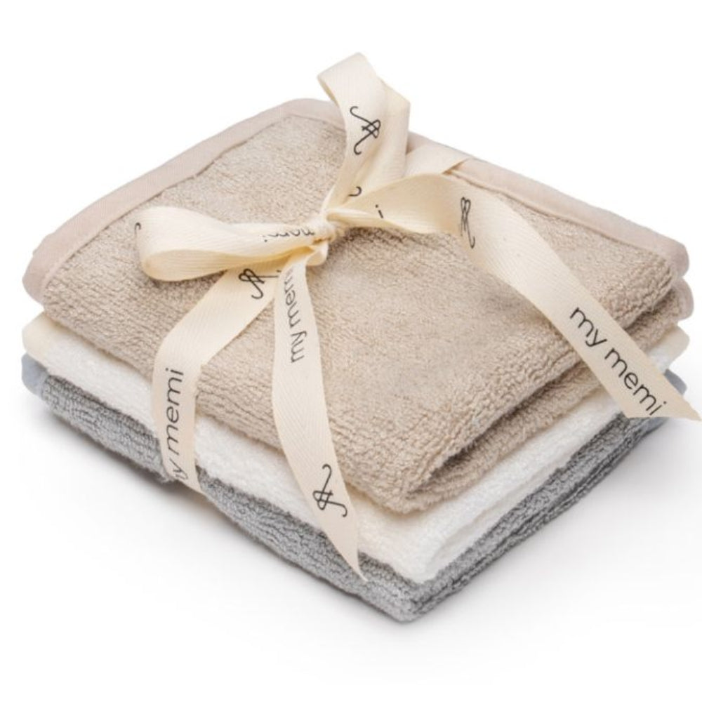 Sada tří funkčních krémových/světle šedých/béžových mini ručníků z bambusu od značky Memi je produkt, který se bude hodit každému rodiči.