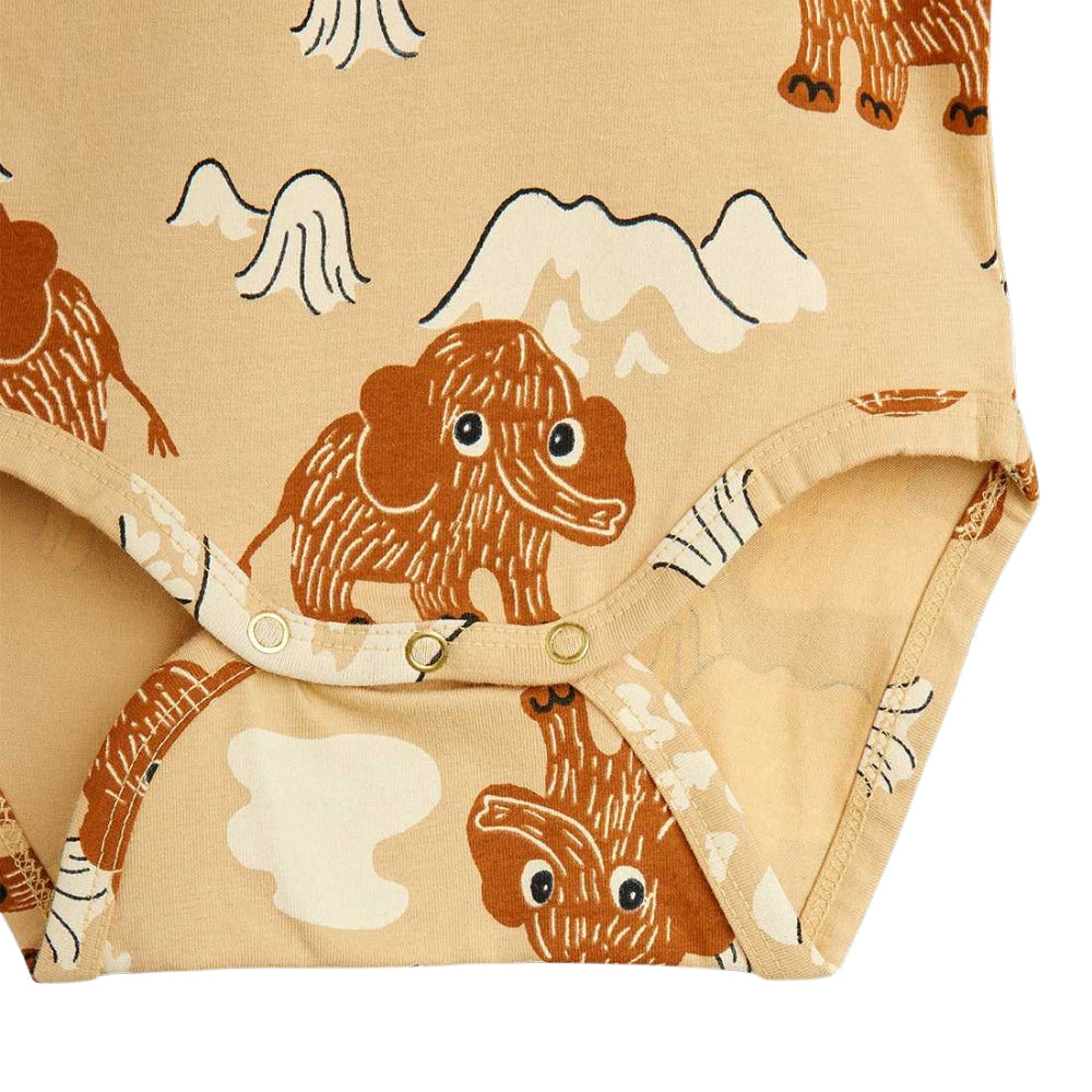 Sada obsahuje body s dlouhým rukávem a legíny, obojí zdobené veselým celoplošným potiskem s přátelskými mamuty na pozadí horské krajiny.