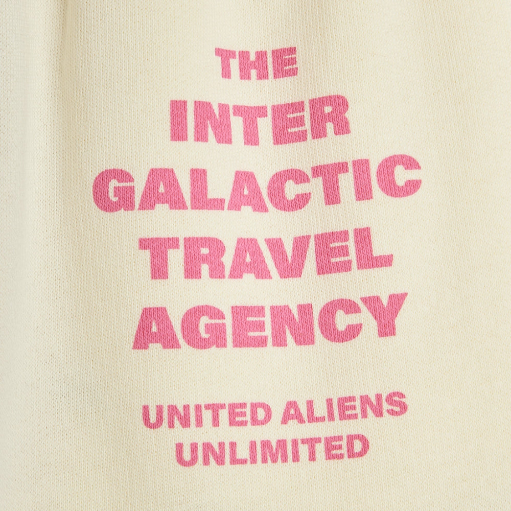 Světlé nohavice zdobí růžový potisk s nápisem The Inter Galactic Travel Agency, který dodává kalhotám moderní, hravý nádech.