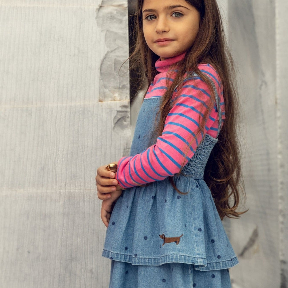 Jemný puntíkovaný vzor a vyšívaný motiv pejska na spodním lemu zdůrazňují dětský, hravý styl charakteristický pro Mini Rodini.