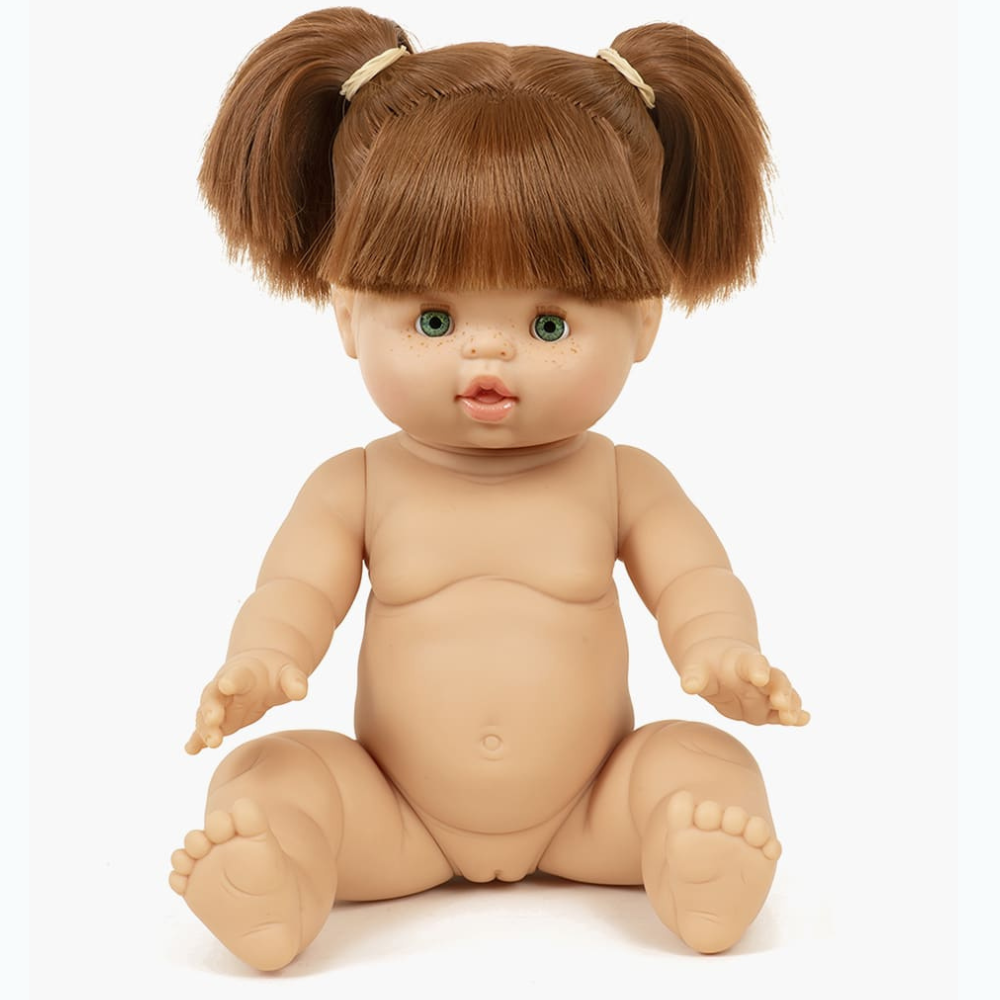 Se zelenýma očima, pihami na tváři a spletenými červenými copánky vypadá tato panenka jako skutečná společnice pro dětské příběhy.