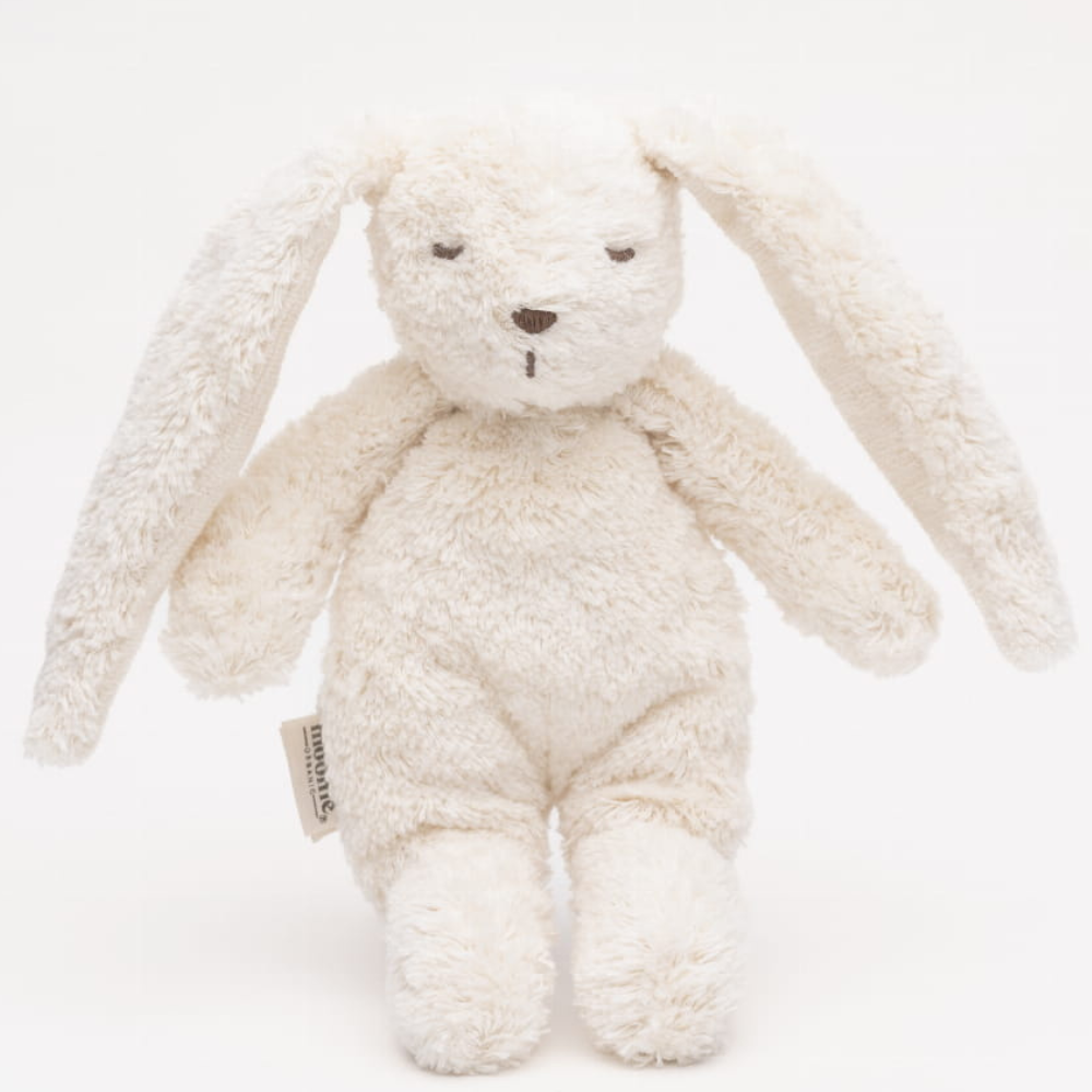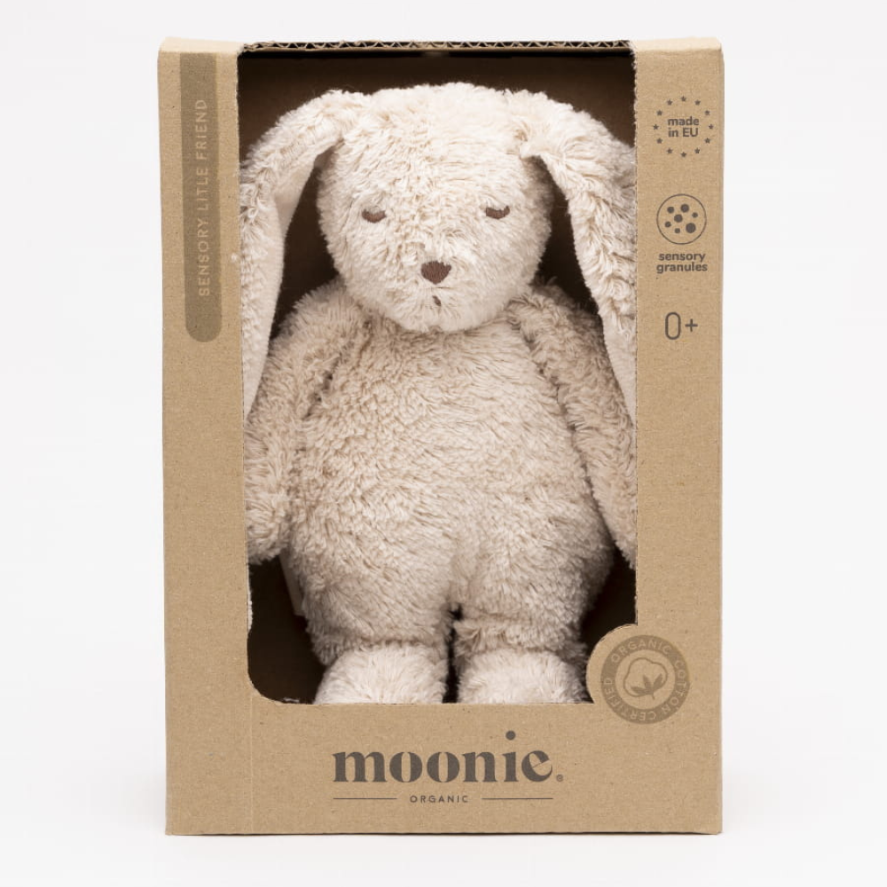 Značka Moonie zde použila bezpečné, na dotek příjemné materiály - organickou bavlnu a měkkou výplň - takže hračka je vhodná i pro citlivou dětskou pokožku.