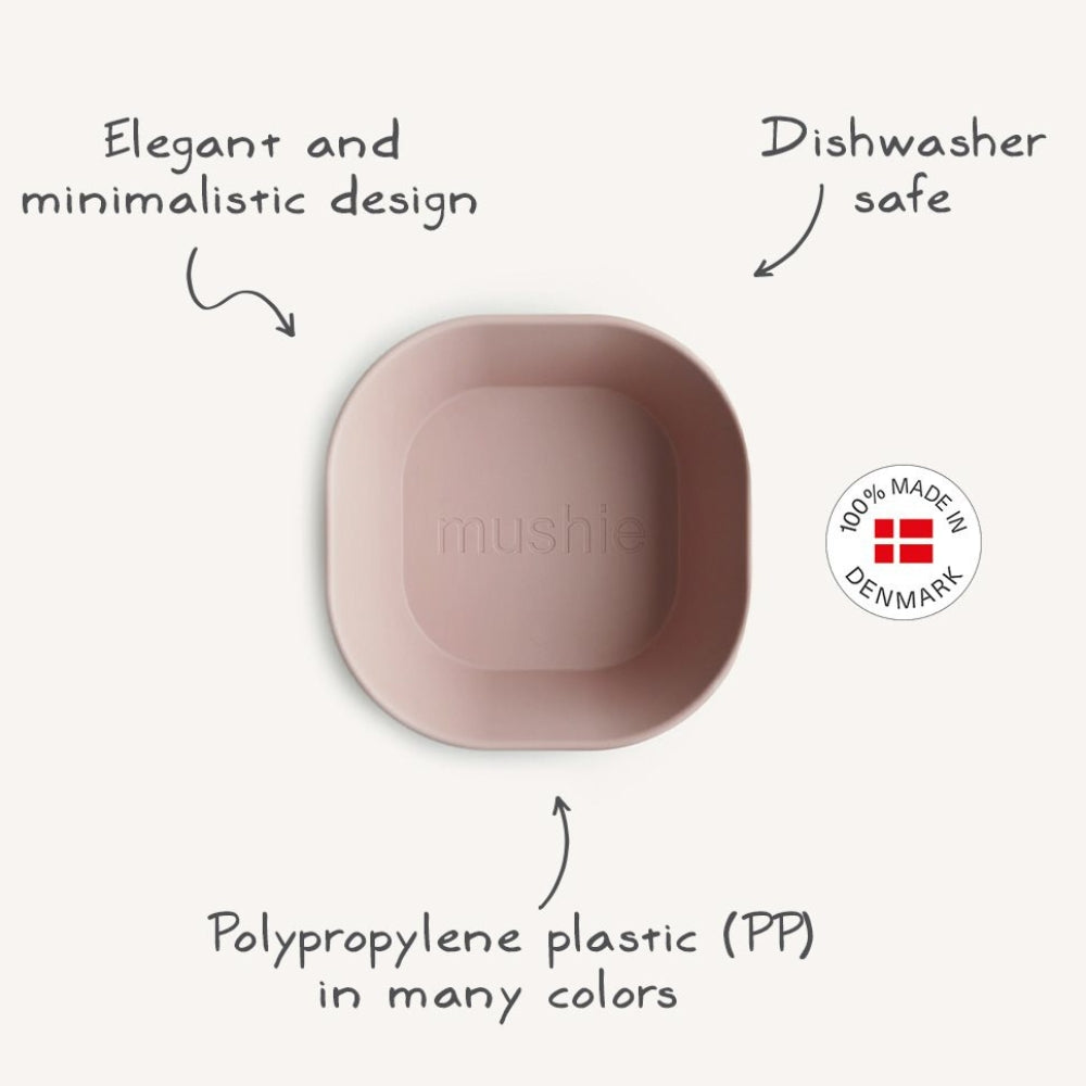 Dvě čtvercové dětské misky Mushie jsou určeny pro první samostatná jídla vašeho dítěte.