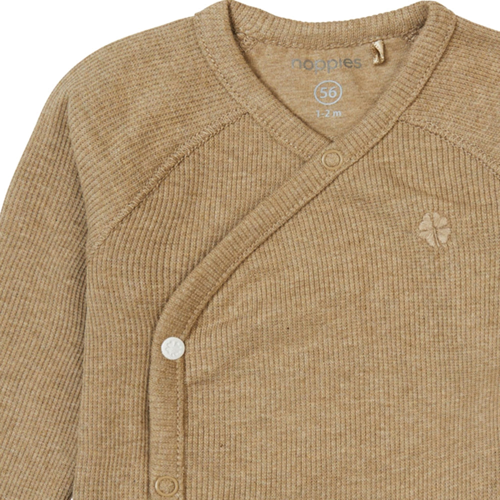 Je vyrobeno z měkké žebrované tkaniny, která poskytuje pohodlí a volnost pohybu. Dlouhé rukávy jsou ideální pro chladnější dny a neutrální barva usnadňuje vytváření kombinací s dalšími oděvy - lze ji kombinovat s odpovídajícími kalhotami a čepičkou ze stejné kolekce.