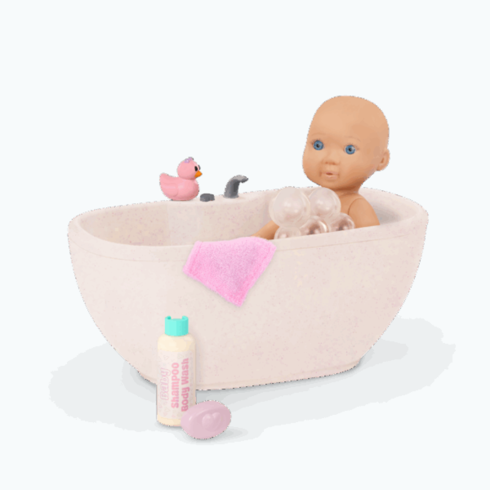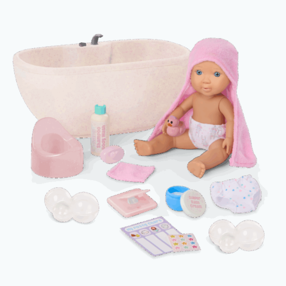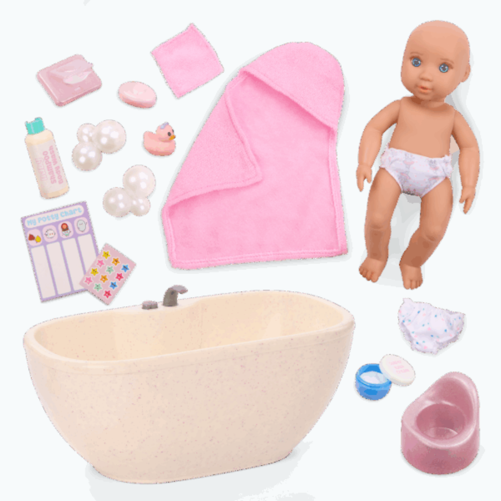 Koupací sada pro panenku Lacy od společnosti Our Generation obsahuje panenku s vaničkou, která děti vtáhne do teplého domácího rituálu kojení.