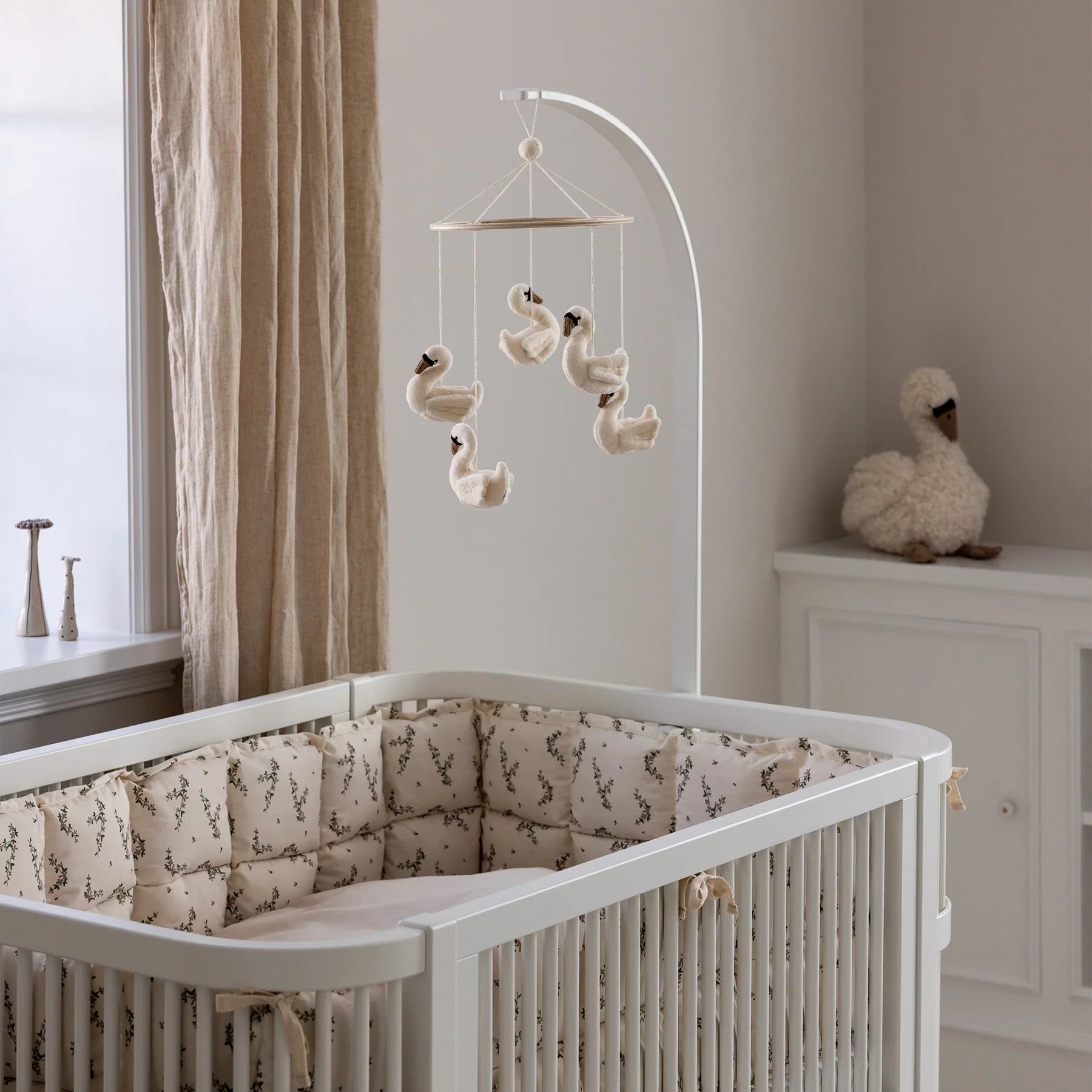 Kolotoč do postýlky Sebra s pěti měkkými labutěmi, které se vznášejí na jemné dřevěné obruči, je krásným způsobem, jak vytvořit klidnou a uklidňující atmosféru nad postýlkou nebo přebalovacím pultem.