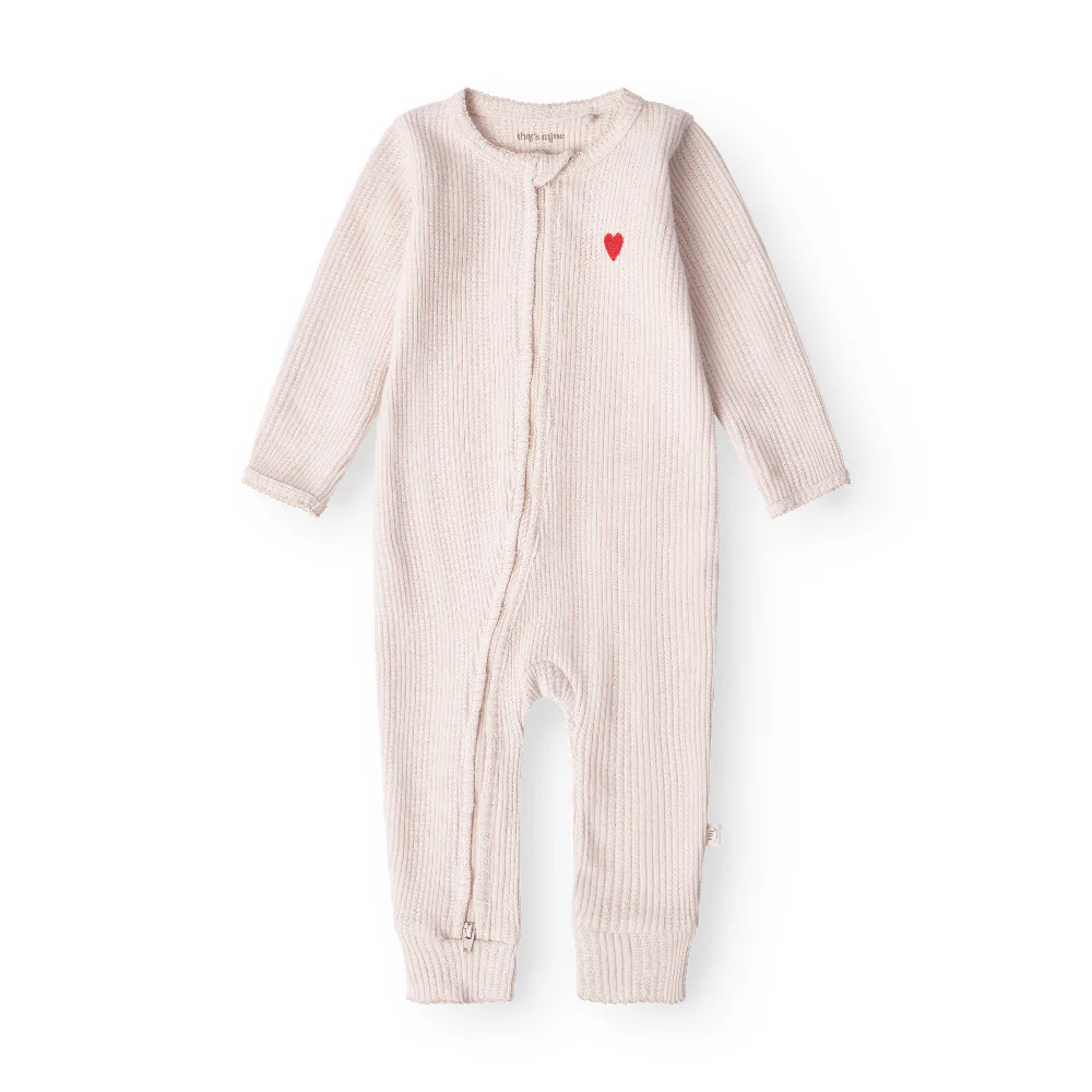 Bavlněná kombinéza "That's Mine" je mimořádně praktickým řešením pro rodiče, kteří oceňují rychlou a snadnou výměnu plenky - díky dvoucestnému zipu stačí otevřít spodní část a vyměnit plenku, aniž by bylo nutné sundávat celou kombinézu.