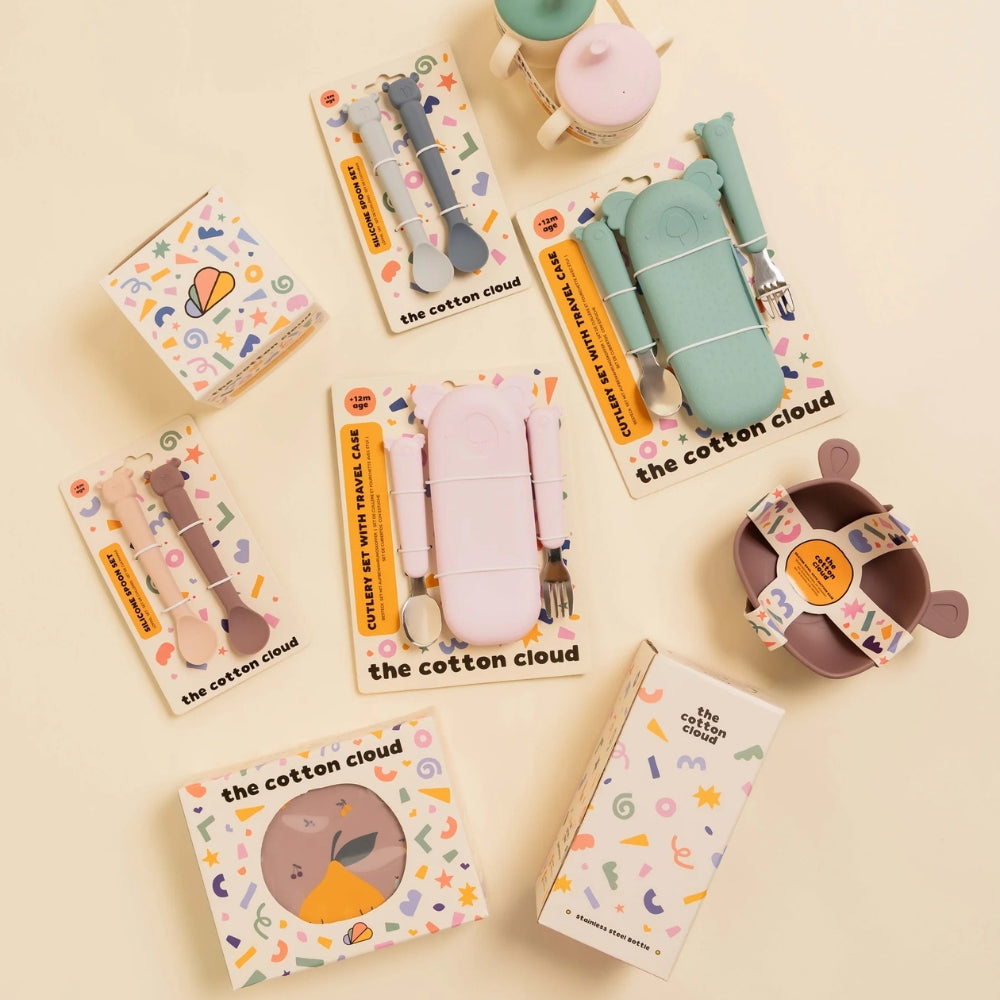 Dětský příbor Cotton Cloud ze sady Zoe the Koala udělá vašemu dítěti radost, když se naučí jíst samostatně.