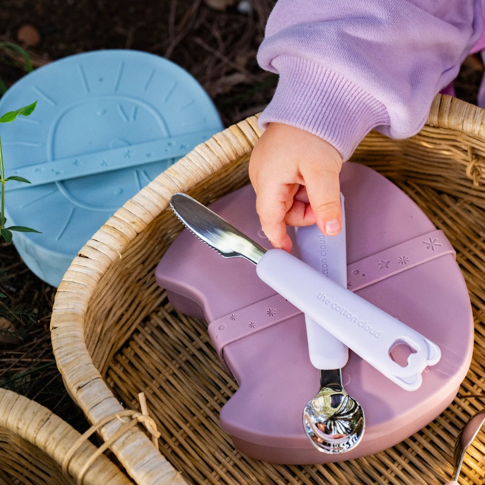 Společnost Cotton Cloud se postarala i o praktickou stránku - součástí balení je silikonový kryt, který umožňuje hygienické uložení příborů vašeho dítěte doma i na cestách.