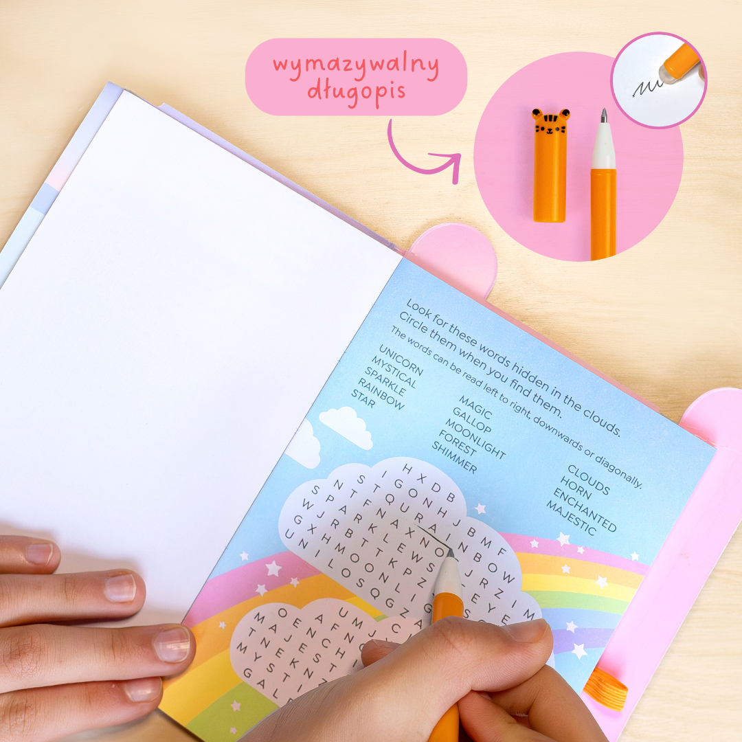 Uvnitř na vás čeká 25 stran aktivit: bludiště, hádanky, slovní hry a logické hádanky a také arch se samolepkami a stíratelným fixem, takže každou aktivitu můžete opakovat do sytosti.