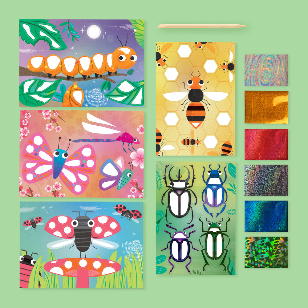 Výtvarná sada Tiger Tribe s fólií - Radostní brouci je kreativní hračka, která děti vtáhne do báječného třpytivého světa brouků, včel a berušek. Stačí vybrat ilustraci, odlepit bílé rámečky a přiložit holografickou fólii a obrázek okamžitě ožije - je ideální k hrdému zavěšení na zeď v dětském pokoji.